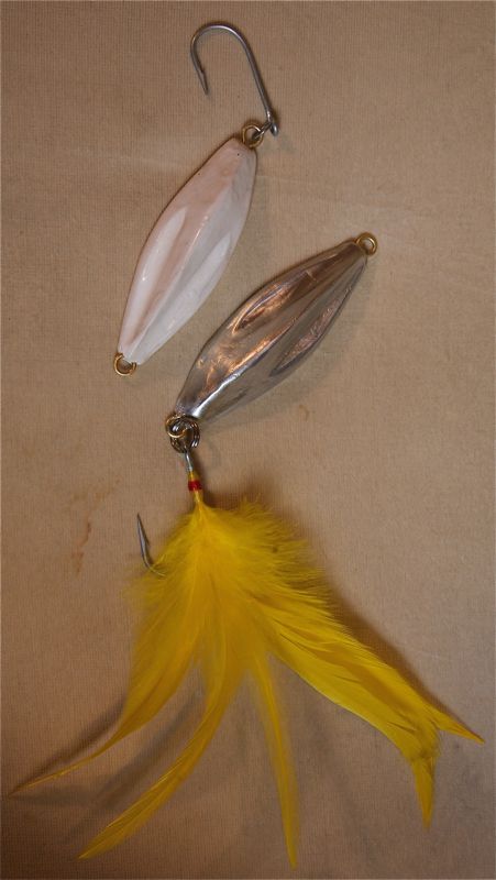 A friend of mine did an On The Water article last fall about the old-timers who made their own tins and it got me thinking about making a few of my own from scratch. I used RTV mold putty for my first attempt and it came out OK, though the putty sets up fast and is a real pain to deal with. 3.5 ounces, swims nice. (that's the one with the clay model in the pic) The third mold I did was made with pourable RTV, which I like a lot better. 2.5 ounces, casts great, beautiful action. I really like this one. (the three tins hanging from the chair) Both are pure tin. I hear there are some bunker around, so I've gotta try them out in the next few days.
