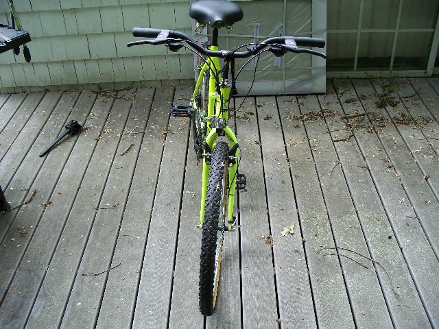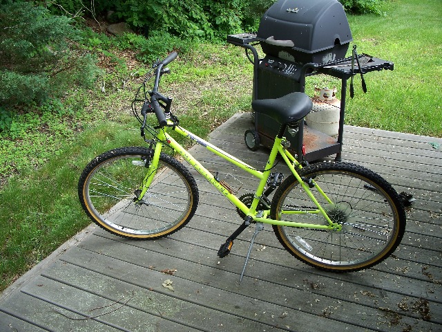 This was my deceased sister's bike. I looked it up and apparently Ross was a high end mountain bike (which doesn't surprise me). This has the bar halfway between a "girls Bike" and "boy's bike" Not straight across , not all the way down. Its not new but my guess is this bike was riden less than 10 times. It has some scratches but mostly its really nice. Its yellow and says Mt Katahdin on it. Looked it up on the net and saw a MSRP of $399. It has 26 X 1.9 nubby tires. Shimano 70 GS shifters.