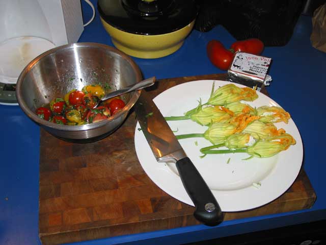Snip the flowers from the zucchini or squash, remove the stamens and fill with cheese and herbs before you pan fry. You can find a real recipe online...