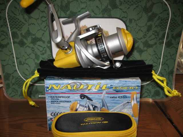 NIB Mitchell Nautil 6500 (Yellow) Waterproof (2 Spare Spools )An inexpensive alternate to a $700 Van Stall. If you need a Waterproof Reel and don't want to spend a fortune,This is the reel for you. These are getting very hard to find NIB. Holds 300+yrds of 40lb Braid. ( 4.57/1 Gear ratio )( 15.9oz ). Titanium line Roller and all corrosion proof parts(stainless components)