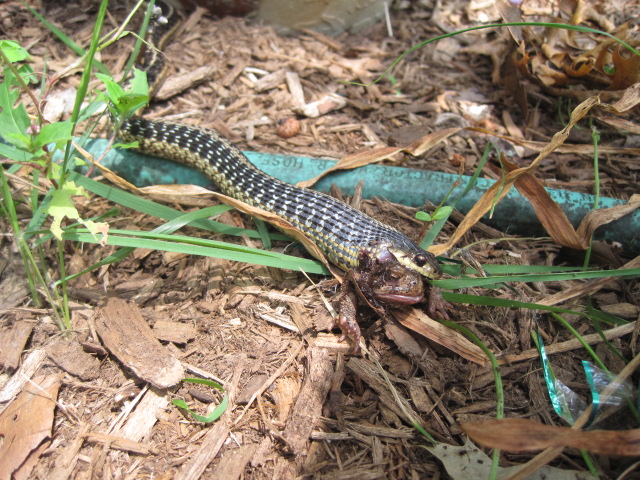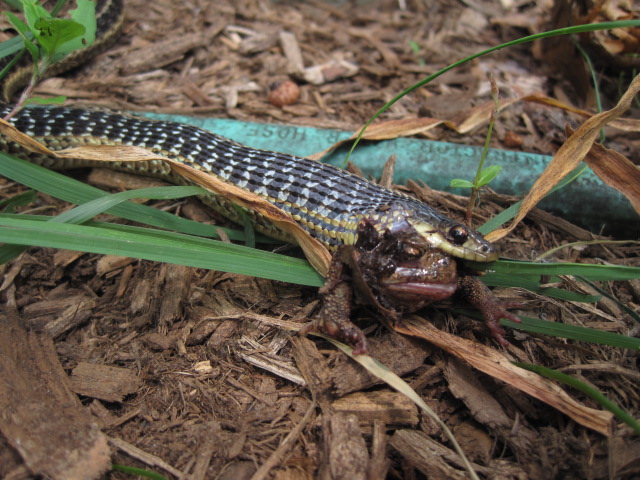 I had a Nothern Water Snake I kept for a while as a kid. One day he tried to eat the frog I gave him from one of the legs. That poor frog made the worst noises...
