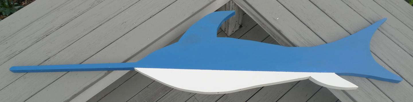 I have three 52 inch long Swordfish Weather vanes made from 1" mahogany faced marine plywood. One is primed and painted Bermuda blue/sailcloth white and the other two are unpainted and need some edge sanding before painting. They look great on top of a barn or shed.