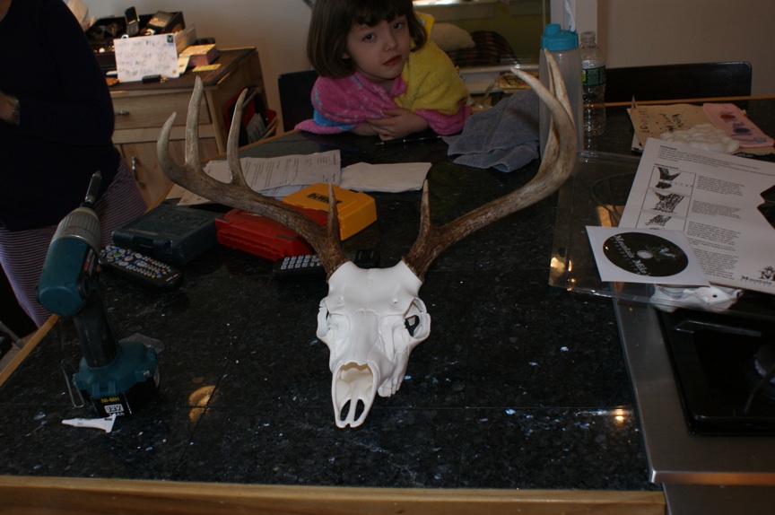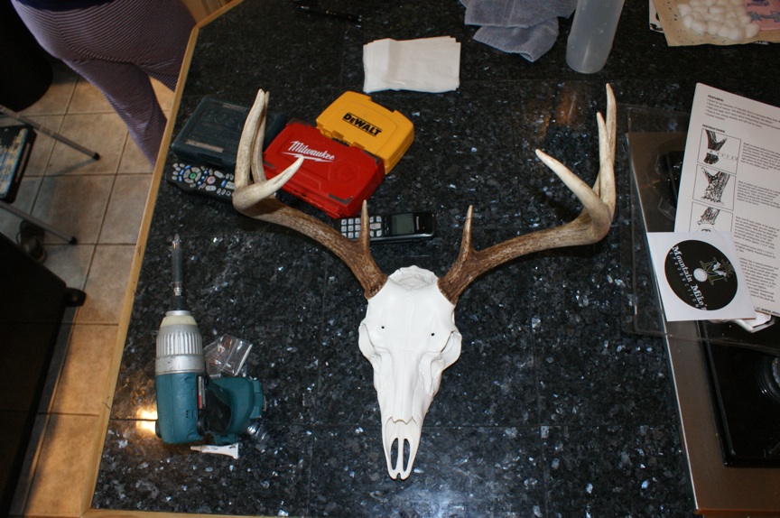 Next flatten or smooth the antler base, I used a belt sander to do them as best as I could. Next step requires a vise or second set of hands, the diameter of the antler above the burr dictates which size skull plate to use. Mine were just under 5" and according to the directions the small plate should have been used, the large plate is use for 5' and up. I decided to go with the large plate as it looked better than the small with the antlers on it. This is where the second pair of hands come in, while holding the antler against the base, have someone drill a 3/16" pilot hole 1 3/4" deep onto the antler, using the hole in the skull plate as a guide. Once this done on both antlers use the screws included to snug up the antlers to the base. At this point you should be able to move the antlers by hand to adjust them. Once they are where you want them, tighten the screws, but be careful not top crack the base. Next mount the skull plate and antlers to the base using the 2 included screws and you are done.
