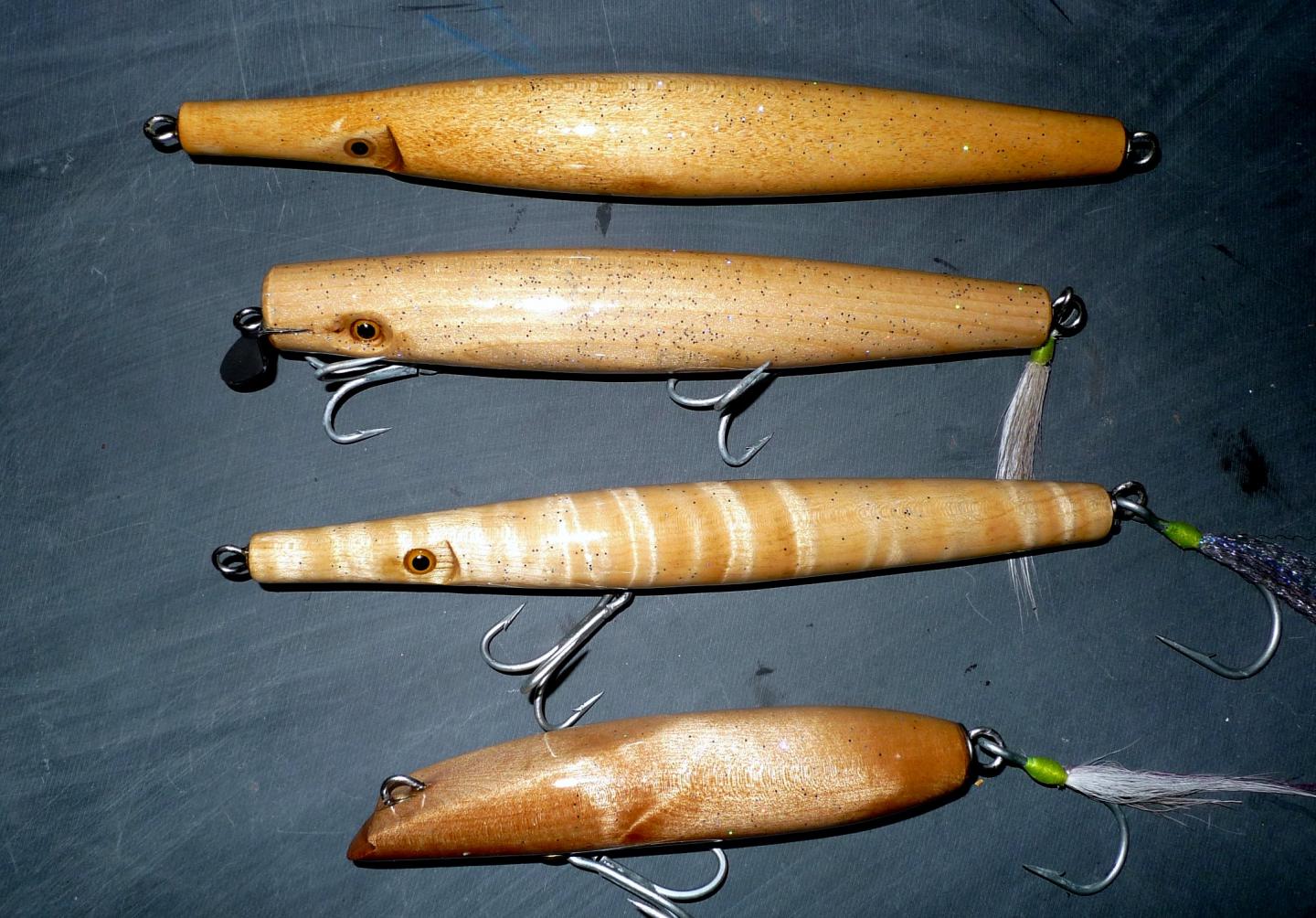 I have been using Devco 2 ton to seal and to top coat my plugs since this spring so I opted to make some naturals with this method... a small yellow birch darter, a white cedar eelie, and 2 maple Wadd style needles including a big 8.5 incher...