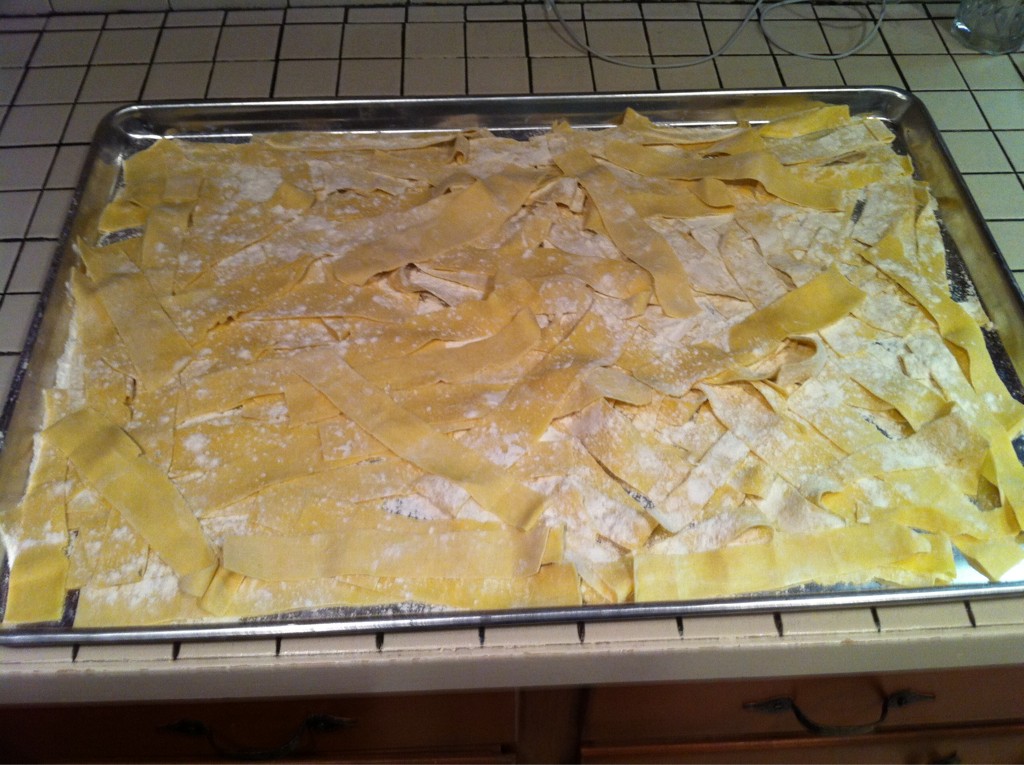 My kids got me a pasta maker for Christmas and it was probably my best gift ever.The first couple months I used it all the time but with the warmer weather we switched gears to the grill. With this cold spell I figured I would break it out for Sunday dinner.I rolled out some sheets of pasta and had the kids hand cut some wide noodles to go along with chicken and broccoli and homemade alfredo sauce.The addition of some red bell peppers made this dish even better. A nice chianti made for a perfect afternoon.Homemade pasta doesn't resemble store bought and is easy once you get the hang of it. Bon apetit.