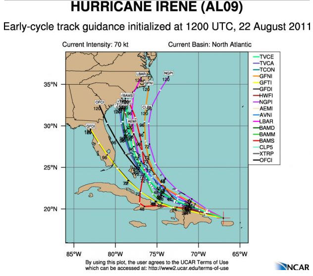 Latest computer predictions: AM hurricane guidance has Irene just south of N.Carolina Sat AM as Cat 2/3 storm, ready to run the coast. Long ways out but interesting track up the east coast, especially if it moves slightly farther east.