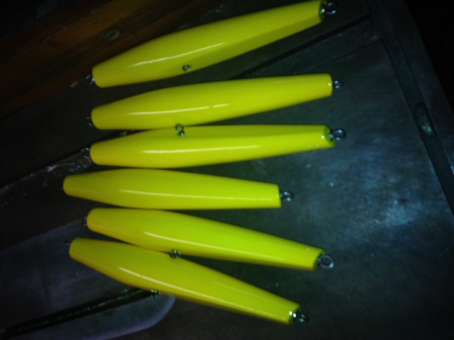 The plugs on the ends had some sadness and fell in my epoxy spinner and the finish is looking sad. Buzz said he would test them for me though, thanks Phil!!! I plan on signing the others for Pat, Ben and Ty, to trade for other lures at Plugfest. With these there are some more small and large pencils for the group to trade also.