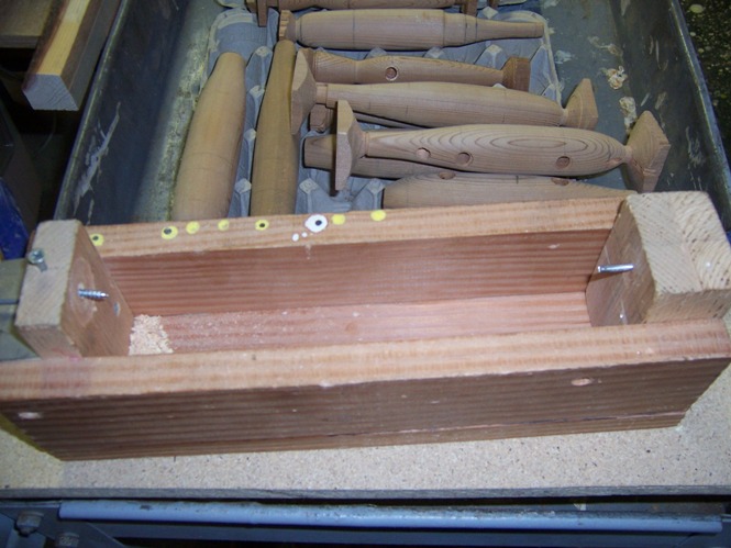 The jig can take lipsless or plugs with a lip... if using it with a plug that has a lip, the head stock is flipped ( held in place by two screws) the lip slot slides on a piece of thin sheet metal.. and a pin goesin the through hole.. the tail stock pin holds the rear.. when using it for darters (like in the picture) it is reversed and a screw inserted in the plug to hold it fast.... the jig was made so the tail stock and lip slot ( or screw) are peerpendicular... a wooden fence on the drill press is set to the correct depth... it is a simple matter of lining up the mark on the belly and the drill to drill the holes....