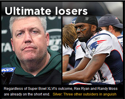 1) Rex Ryan: If Super Bowl week will be uncomfortable for Manning, it’s a full-fledged fiasco for Sexy Rexy. The Jets’ coach must wistfully watch a media circus involving not his favorite public personality (himself) but, instead, the two franchises he has openly targeted and – as of right now – failed to surpass. The Patriots, with whom the Jets have vied for AFC East supremacy (and the team they eliminated from last year’s playoffs, which triggered a whole lot of gloating), have reestablished themselves as the Team of the Century. The Giants, the object of Ryan’s competitive taunts since he took over as coach before the ’09 season, not only humbled him in a late-December victory that essentially killed the Jets’ playoff hopes, but they also improved to 5-0 in NFC championship games (Ryan is 0-2) and are the clear-cut Kings of the City. In Ryan’s 2011 book, “Play Like You Mean It,” he wrote, “I have news for you. We are the better team. We’re the big brother. People might say they are the big, bad Giants, but we are not the same old Jets. … To me, it seems clear that right now we are the better team and we are going to remain the better team for the next 10 years. Whether you like it or not, those are the facts, and that’s what’s going to happen. I know it’s going to happen because our style of football is different. We are going to take over the town whether the Giants like it or not, so those fans on the fence that like both teams are going to be Jets fans in the end. The truth is, if I am going to watch one game, I am going to see the Jets, without a doubt. We are better.” Uh, what was that you were saying, Little Bro? You’d think Ryan might have backed off after hearing taunts like “it’s time to shut up, fat boy” from Giants running back Brandon Jacobs, but the man can’t help himself. (To be clear, as a journalist, I am not complaining about this in any way.) Before the AFC championship game, Ryan, a former Baltimore defensive coordinator, went on New York’s WFAN and proclaimed, “First off, the Ravens are going to win this game.” Alas, they didn’t – and now there’s no question that Ryan is the Biggest Loser of Super Bowl XLVI, regardless of what happens in the game.