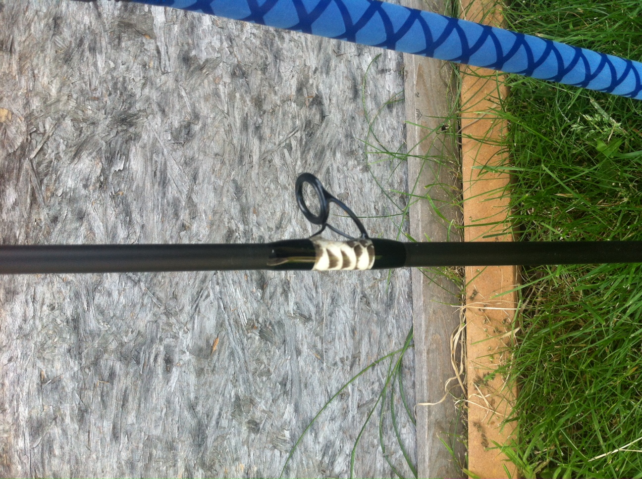 I built it in march and only test casted it after it was built, has baby blue x flock grip with o rings underneath for added grip, snakeskin crosswrap and snakeskin under wraps on the first three guides, fuji alconite k frame guides, fuji deluxe reel seat size 20 will hold all your standard reels, slim butt cap, metallic blue wraps on reel seast and skin. all high end components.