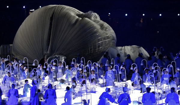 The Boyle ceremony got underway with images of a bucolic Britain being swept away by a cigar-chomping elite that builds satanic mills filled with oppressed workers as steeplejacks hang from the towering chimneys. Later, 600 doctors and patients recruited from National Health Service hospitals were featured in a bizarre tribute to socialized medicine, with children bouncing up and down on 320 hospital beds arrayed in front of a giant Franken-baby wrapped in bandages. love that "FRNKENBABY" Villains from British children’s literature, ranging from Cruella de Vil to Lord Voldemort, sweep in on the children, in an apparent reference to conservative forces seeking to reform the tottering NHS. The 15-minute sequence ended with a series of red lights triumphantly spelling out “NHS.”