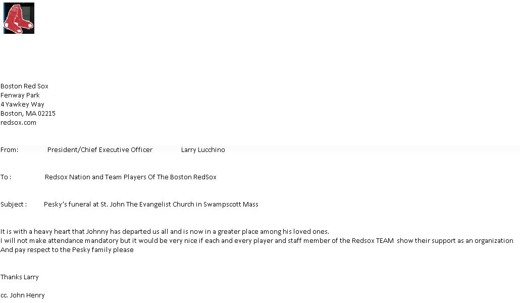 Lucchino, owner John Henry and his wife, Linda, Sox CEO Sam Kennedy, GM Ben Cherington and many more team execs and staff were on hand to bid Pesky a final farewell. Also in the pews were former players like Nomar Garciaparra, who made the trip from California for the funeral and was visibly upset during the ceremony; Jim Rice, Bill Lee, Jerry Moses and Mike Andrews.
