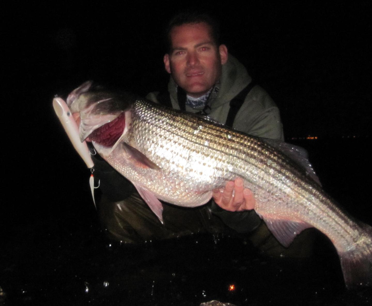 Here's a conrad fish, nothing special (maybe #15), but illustrative that you need to cover the water column top to bottom when you fish. Tough night, very calm and little sweep, nothing showing. Worked the jetty spot thoroughly with dannys (surface), darters (midwater) first without a touch. I was pretty sure it was empty, but felt compelled to try dredging the bottom. Drove a conrad down, worked along real slow, made about 10 cranks and pow. Telling that this fish must have watched the other plugs pass over it 30 times without interest, but when I put a conrad in front of its face...... bingo.