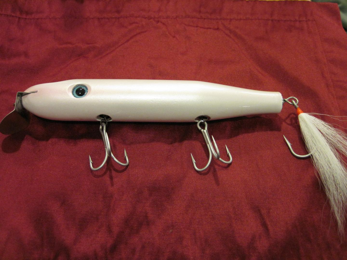 Plug has a Russ Tango look to it. Neat. But what's with the tuna swivel? Lose that and your plugs will swim and fish even better.
