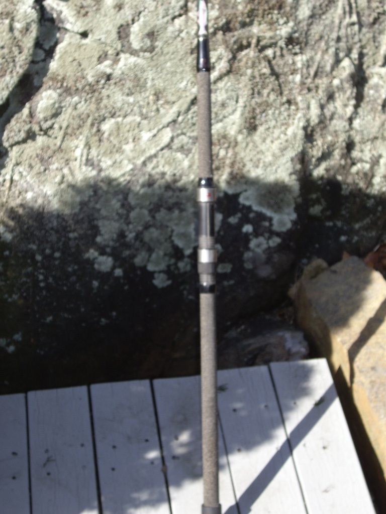 Also a cut down Batson SW1088 (rated 1-4 oz, good eel/plug rod) wrapped by MikeCC. Spinning. 17" from butt to top of real seat lip. Cut from butt, now measures 100" or 8'4". Basic black wraps with striper decal. Cork tape handle. Fuji hardloy guides and fuji seat. Used as back up only. 95.00