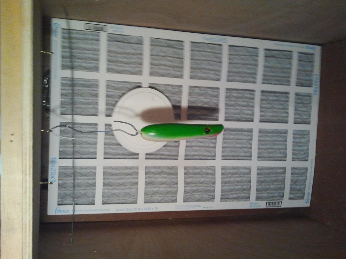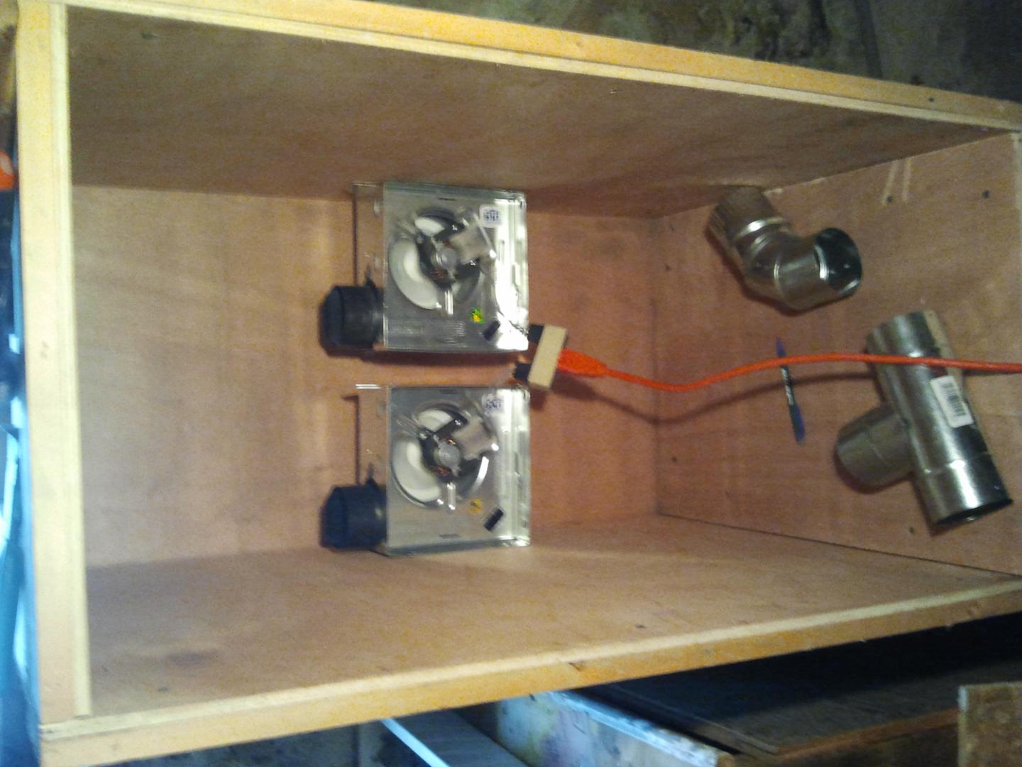 Well, here it is. I'm sure it's not much to some people, but it was by far the most technical thing I've done thus far. It has 2- 50 cf/m bathroom vent fans. The vent off the fan was 3", so I used 3" 90deg duct brackets to a 3" T, then fed that into a 4" flex duct. I couldn't seem to find any 3" flex duct, so I used a zip tie to snug it down. A few screw in hooks and a hanging wire should give me options depending on the size of plug I'm spraying. Used a 17"x25" febreeze furnace filter.