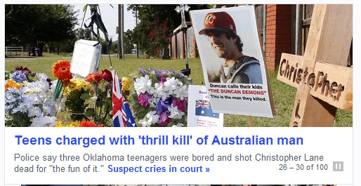 Christopher Lane, 22, of Melbourne, died Friday along a tree-lined road on Duncan's well-to-do north side. Two teenagers, 15- and 16-year-olds from the gritty part of the town, were charged with first-degree murder and ordered held without bond.