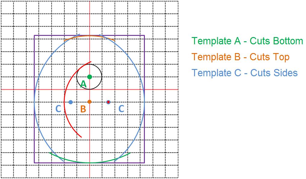 In the picture below, you can see the arcs created by each Vega template. The purple rectangle indicates the minimum dimensions of the wood blank (1.125” x 1.25”). I decided to use 1.5” x 1.5” x 9” stock (EWP).