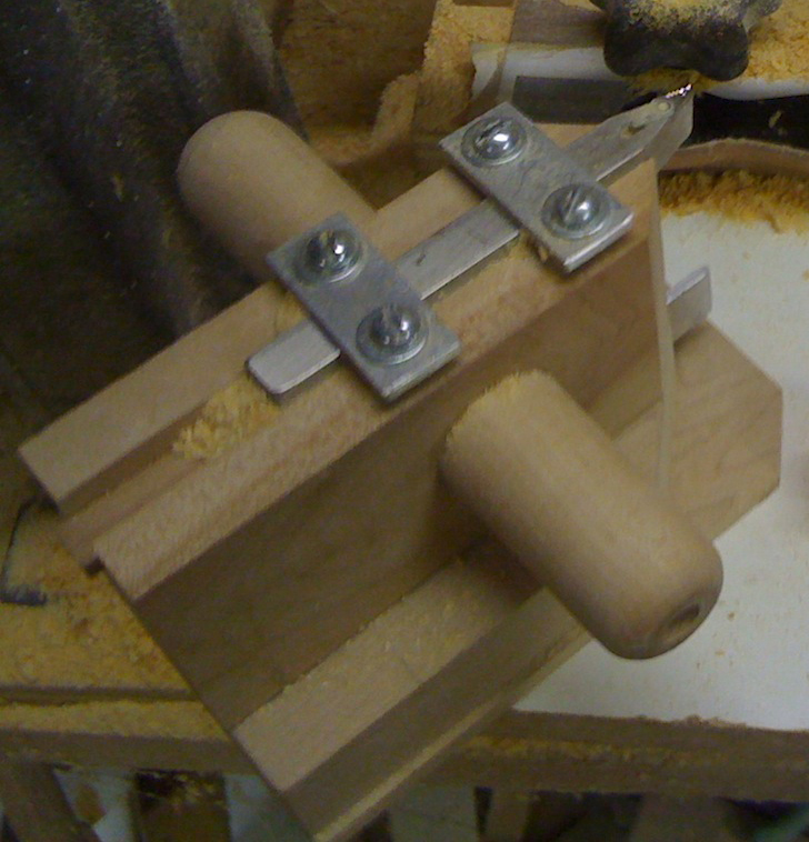 As far as getting the cutter height exact, you can do it with shims. The groove is pretty tight side to side on my sled but about 1/8" too deep for the tool holder. I have a small block of maple in the groove as well as a couple of shims to tweak it to the correct height. The shims are made out of some stainless I had leftover from making lips. Everything locks down tight and works great. You can see the end of the wooden shim sticking out of the groove at the back of the sled in the photo on the right. The 4 #12 screws hold everything firmly in place.