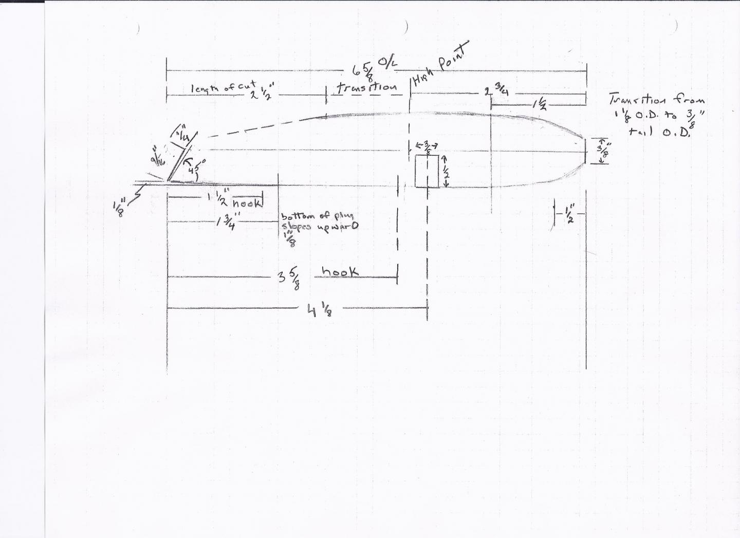 I uploaded this file in antique plug forum in reply to a post there about a plug i.d. inquiry and thought that if anyone wanted to see the actual diagram I made after researching Frech's 6 5/8" darter that I gleaned from several different articles I found. These measurements are the exact same as Frech used. I just gather them all up and put them on one drawing. I f I remember correctly I found three different drawings. The only thing I asn't able to actually discern was the total weight Frech used in his plugs. I have used "00" and it works really well in the plug made from AYC. Prior to this I made the darters from maple, which not only cracked but doesn't swim nearly as well. Although they did catch, as Andy Stephenson can attest too.