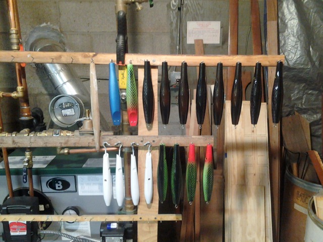And then start drilling weight and hook holes on the 50-70 plugs I turned a month ago, mostly Donnys and wadd needles and some odds and ends like super skinny pencils and some metal lips