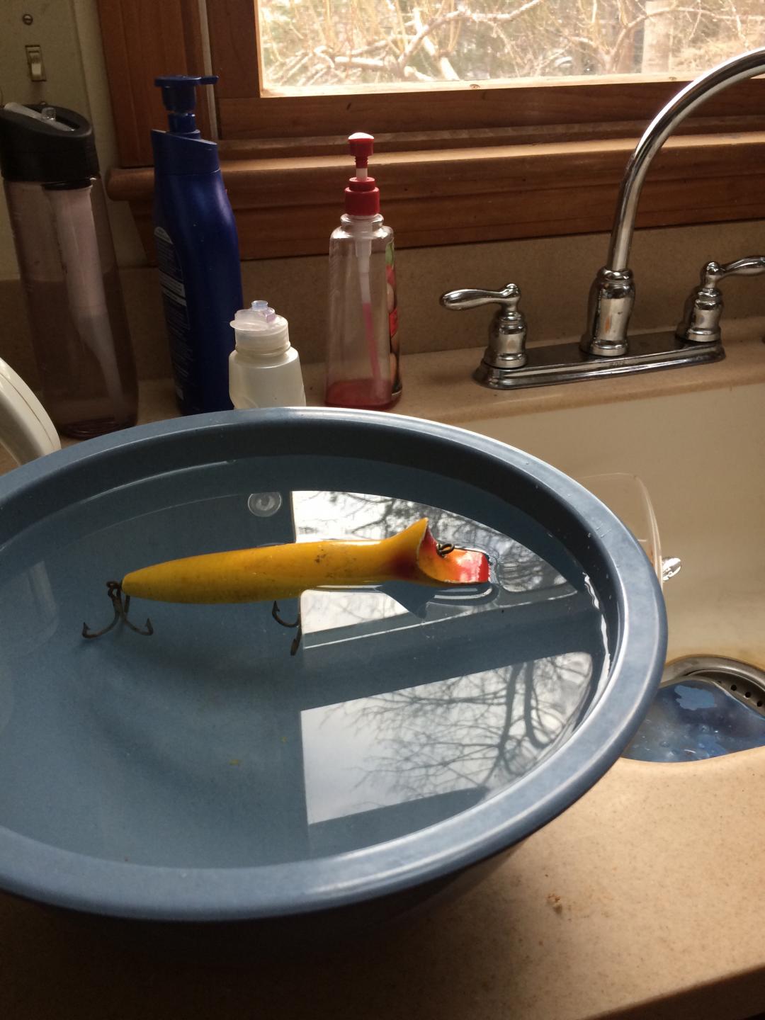 This is an old 2 oz Gibbs, it floats at an angle with the lip above the water. I know my plastic superstrikes sit lower in the water.