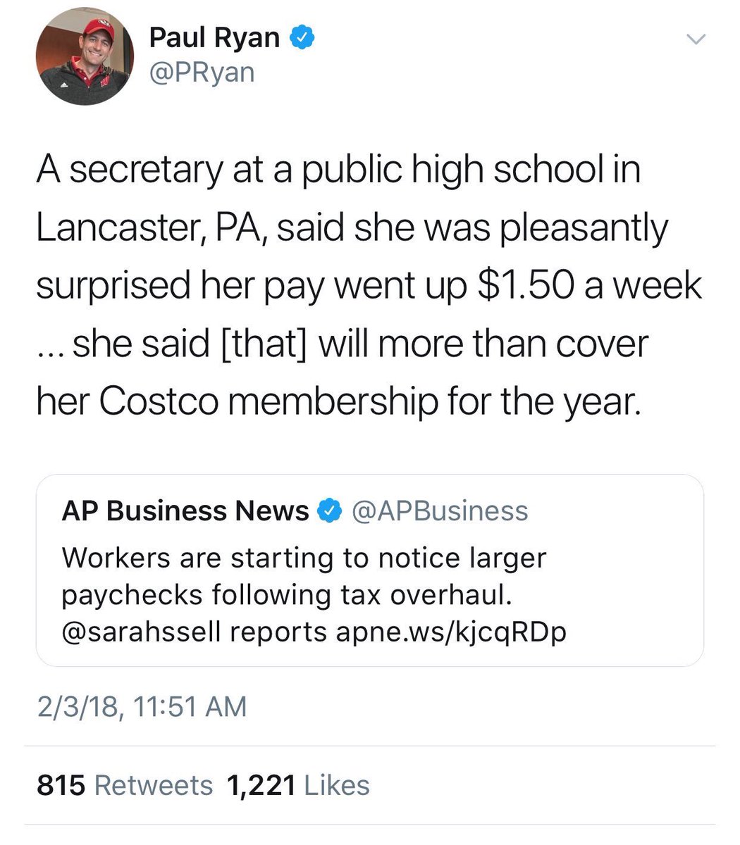 If ryan tweeted that, it’s idiotic, though if she said she’s happy, that’s what matters. Wdmso, Apple is paying a 38 billion dollar tax on bringing back 250 billion in cash. Apple announced 20,000 new jobs. Exxon and Comcast each announced tens of billions in infrastructure investment. Does any of that matter? Isn’t it good for your union if the private sector expands its tax base?