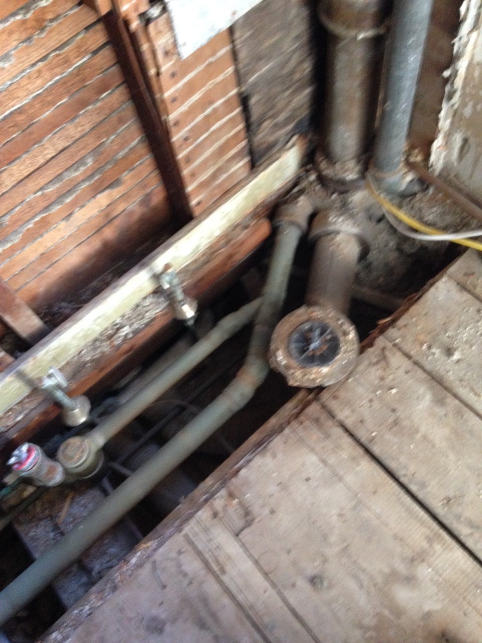 Huge granite mill built on a sloping ledge...discovered that access from underneath was not possible...after crawling as far as we could through the catacomb like crawlspaces. So I opted to cut an access hole in the lowest area of the floor, where I thought the problem was. I was certain the hole would be right beside a support beam below and I was correct.