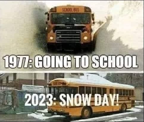 Paul, there is no snow. The local forecast was for 1-3" in this town. Temps were to be above freezing. The risk was not there. Lawyers and insurance companies have scared people from doing what they want and need to be doing. Stop pushing this fear of what if? You have now lived into your sixties (I believe) and you are still here... despite taking the risk of wetsuiting out to various rocks at night. THAT can be construed to being much more risky than putting kids on a school bus HERE this morning.