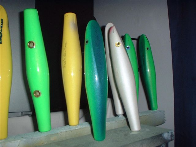 the needles have been tweaked with 3 to 5 colors on some along with the surfsters. got a mess o fish on them and these are the plugs made from the master last year.