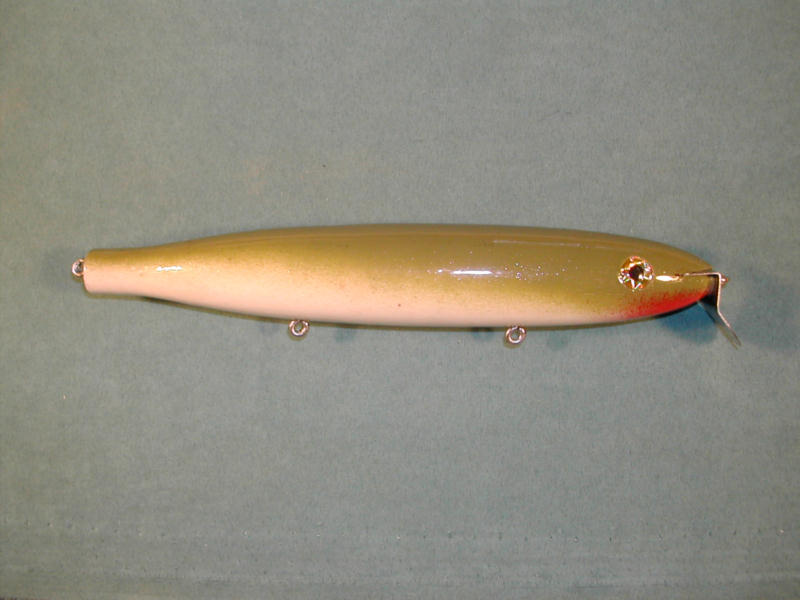 This guy's about 7" long, a little over an inch in diameter at the fattest point. It has a #1 NJT Lefty lip, screw in the high slot. No belly weights. Will be rigged with either 2/0 or 3/0 VMC hooks. Swimms about 12 to 18 inches under. Haven't tried it in heavy curent yet...