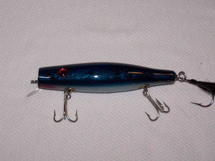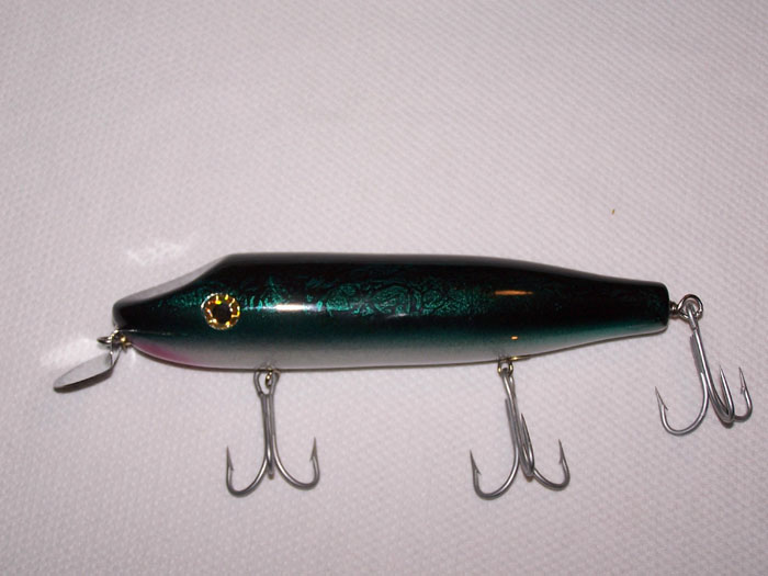 The pikes are 8' + the lip, green one has 5/0 hooks and the blue one has 4/0s