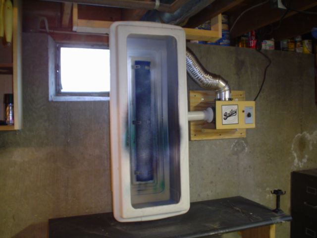 what bluefishercat said, if you use your dust collector it must blow outside(unless you use harmless vapor paints and don't mind breathing them). on my unit everything blows outside thru dryer duct- dust and fumes alike, sealed isolated electric motor will not ignite anything. i use dual particle filters, works like a charm  .