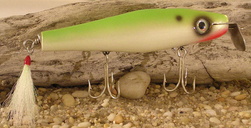 Although the research and development department of Habs Custom Plugs is alive and well -- it is now missing this prime example of custom, taylor designed, wood spinning and painting.