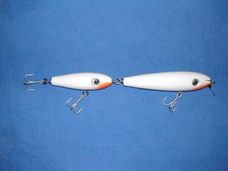 Just came back from test swim.... First cast got dive bombed by three gulls... No hook ups however :-) Swims a bit arse down in the rear small plug. Will take off trailing treble hook and see if that balances it out. Or I add a bit of lead under the nose of the small plug. Beautiful snakey motion to it!