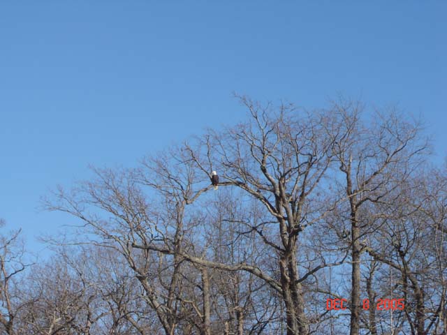 I had a huge hawk in the trees that are at the back property edge two days ago. Snapped a picture of it facing the other way overlooking a ten acre field. It usually is in the 100' tall pine trees about five hundred feet northeast of my house. That is a sight to see but not like the eagle.