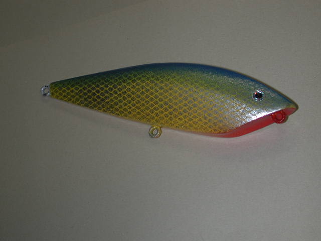 This is different. For several years now I've wondered why we don't make sinking plugs that swim like a heavy spoon or tin squid. Turns out someone else figured this out years ago. I found this plug in the bottom of a tackle box I used as a kid (35 years ago). I don't know what it is called (if you can identify it please tell us) and I always thought it was a popper that doesn't pop. But it turns out it is not a popper at all, rather it is an ingenious swimmer. It's action is something like a good swimming needlefish, or littleneck popper, though it swimms better than either. Give it a tug and it will lunge to the surface, pause and it drops with a wobble, retrive steady and it sways along flashing its flanks and swinging its tail. I haven't fished it, but I suspect it should be good. I've made a bunch of copies, all bigger, out of pine and maple. They take ALOT of lead, but boy do they look good in the water. Now if i can just learn how to paint 'em.