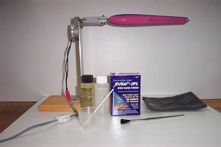 This is all you will need to finish a plug with the exception of paper towels and a little rubbing alcohol.The mixing cup and stick are made by Flexcoat and are available wherever you can get rodbuilding supplies. The scuff pad is made by 3M and is available at hardware stores. Get the gray color it is finer than the red. The brush is an acid swab brush . I get small boxes of envirotex, usually the 8 oz. kit. That will do 25 - 30 plugs. Enough for a while, you don't want to keep the stuff for a couple of years it will go bad. The 8 0z. kit is about 5 or 6 dollars. One more thing, whatever motor you use spend a dollar and get a thumbwheel switch for the electrical cord, much easier than pulling the plug when you want to stop the motor while you're applying finish.