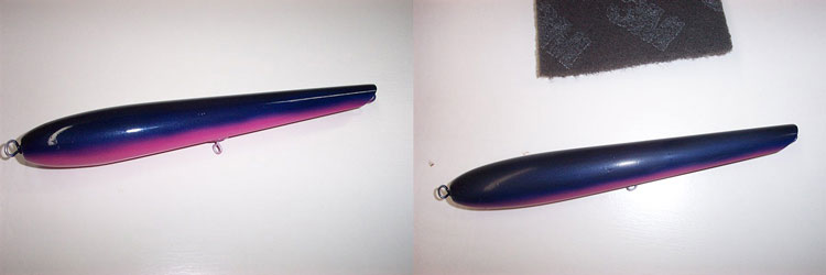 When I'm done painting a plug I put a couple of thin coats of clear on it to protect whatever spots, stripes, etc I put on the plug from being rubbed off during the scuffing process. I like to give the envirotex something to grab onto. The picture on the left has clear on it, notice the shine. The picture on the right has been scuffed with the pad, just enough to dullen the shine. Now attach the plug to the spinner and turn it on and bend it so it spins fairly level. Before I start applying finish, I dampen a paper towel with rubbing alcohol and wipe the plug in one direction only as it spins until I have cleaned the entire plug. The paper towel should only be damp to the point that you can watch the alcohol evaporate right behind the towel as you wipe. Too saturated and it may start to eat into your paint. This is to remove oil from your fingers and dust from scuffing.