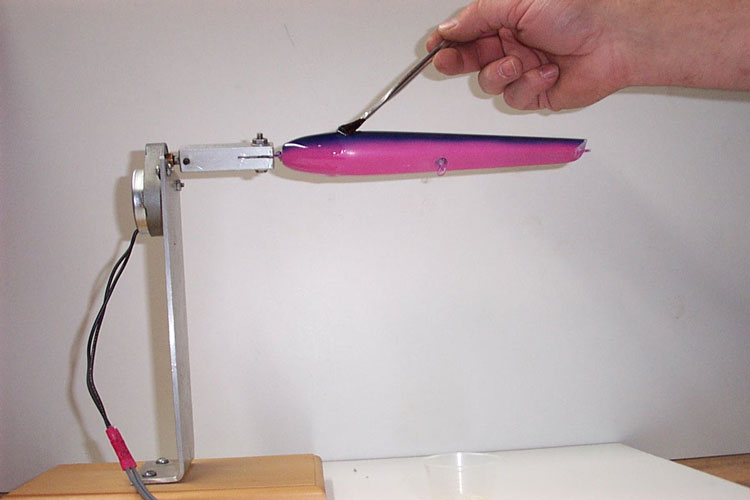 When you mix envirotex in the cup I use equal parts in the cc column. I find that 5 cc and 10cc are about as small as you want to go and get accurate measurements. That is 1/4 of an ounce. I've coated two 3 1/2 oz. poppers with that amount but when I'm only doing one plug I still mix that amount and don't feel like I'm wasting it. Mix it slowly for approx. 5 min. with a round stick. Round sticks will not introduce as many air bubbles into the cup as will a flat stick. When you begin to stir the cup the envirotex will become hazy, you must keep stirring until it becomes clear again. I usually go 5 min. whether it needs it or not to be sure. Flick the acid swab brush against the palm of your hand a few times and pull on the end of the bristles to pull out any loose ones. I usually find a couple in each brush. This saves you from picking them out of your plug. Right before I start I blow on the plug with my breath to remove any dust particles that may have settled on it. I brush on a fairly heavy coat starting at the tail and working my way forward while the plug is spinning.