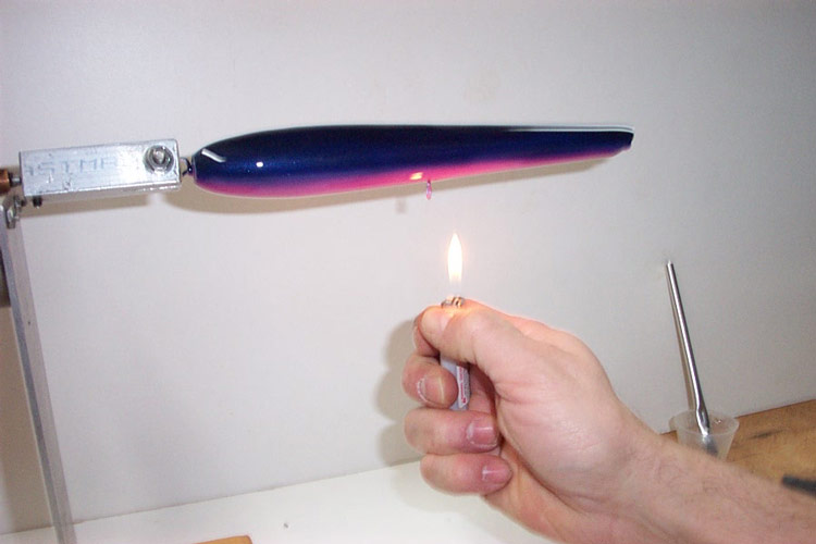 At this point it will be time to remove any air bubbles in the finish. I used to use a lighter but now only my breath. Hot breath works better than cool breath. It's not the heat of the lighter but the carbon dioxide in the lighter or your breath that pop the bubbles. If you are going to use a lighter the picture shows about how close you can get without burning anything. Move it back and forth at a pretty good pace about that far away. When you see the finish start to run over it self as it spins you'll know the finish is very warm and thinning out and it's time to quit. Don't worry the finish will flow back out. By the way the lighter was a prop, I took the bubbles out of that plug in the picture with my breath. The finish will flow for probably an hour, I've gone back and fixed a spot 20 min. later and it looked awful at the time, but flowed out fine in the end. After 8 hours or so you can hang up the plug to finish curing. You may leave a fingerprint or two but amazingly they will dissappear. I have fished them as soon as a couple of days but now is the time to do plugs because they have plenty of time to cure. I have some friends who put envirotex on factory plugs just to protect the finish. I hope this helps ...mrpogie