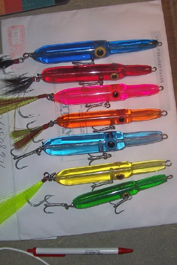 I did these needles last winter on a wim. I was down the basement and found a 3/4 " plexi rod. A flash came to me. At first it was a novelty until a read an article on plug colors. Author mentioned that if a plug was clear it may work on bright moon nites. I made a spare, put in red eyes with a rubber skirted tail hook. The color dropping in the wire hole,going end to end would look cool. I like your colored needles in the previous posts. Where do you purchase colored plexi rod? Keep those great plug designs coming. Hope to get a picture on the thread of my needle shortly.