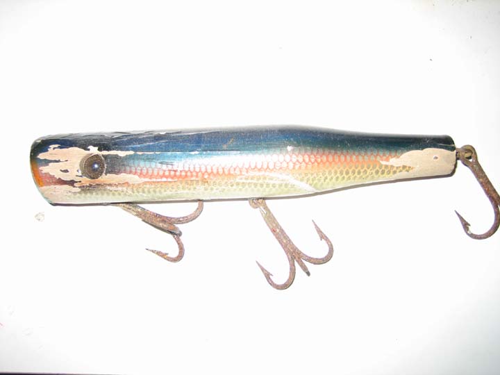 I got a popper i got off the "bay" a few years ago for less then $10, the seller listed it as "old wood lure". Its about 7" and about 3 ounces and has a blue mullet paint job. The odd thing about it is the popper mouth, instead of being just carved out its a scooped metal plate, never seen anything like that before, any ideas? Thought it might be a Point Jude cause of the color, ill post a picture next week when i can get my hands on a digital camera.