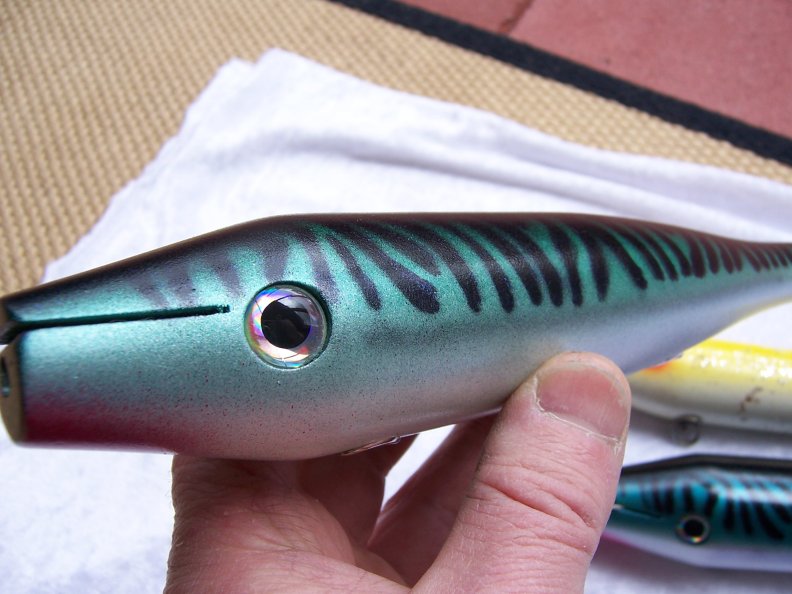A pair of trolling plugs. These are actually my first turned wood about a year ago. I made the mistake of forgetting about them in the sealer for 24 plus hours.  The wood is 30 year old sugar pine so they sucked up the sealer and it took a good 6 months for them to finally dry. I had to fabricate the lips. I used the Gibbs trolling plug as my shape. I just went bigger. Still need to wire them up. Any recommendations on the hook size. Another problem I am encountering is I need longer swivels because of the larger dia. of the plug. Thanks . Paul