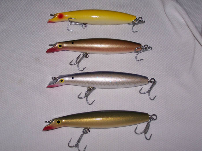 The top one was made by Larry on Long Island and sold through the Surfcaster back in the 90's I believe. It is the only real one I have so I made a few more to fish this season. I used Upol as a top coat to see how it holds up. My feelings are that the VMCs will tear them up though. Only time will tell. These were made with white pine and work just like the original.