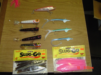 4 Rattlin Chug Bugs, 1 skipper type lure, 3 Delta Skalliwags and 2 packs of 6" sluggos (1 Arkansas Shiner and one Bubblegum)