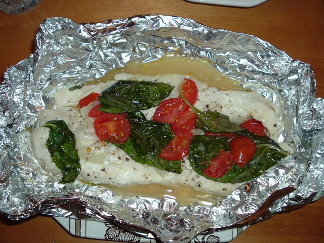 vidalia onoin, cracked pepper and salt, a little butter and olive oil tomatoes and some fresh basil : in foil on the grill