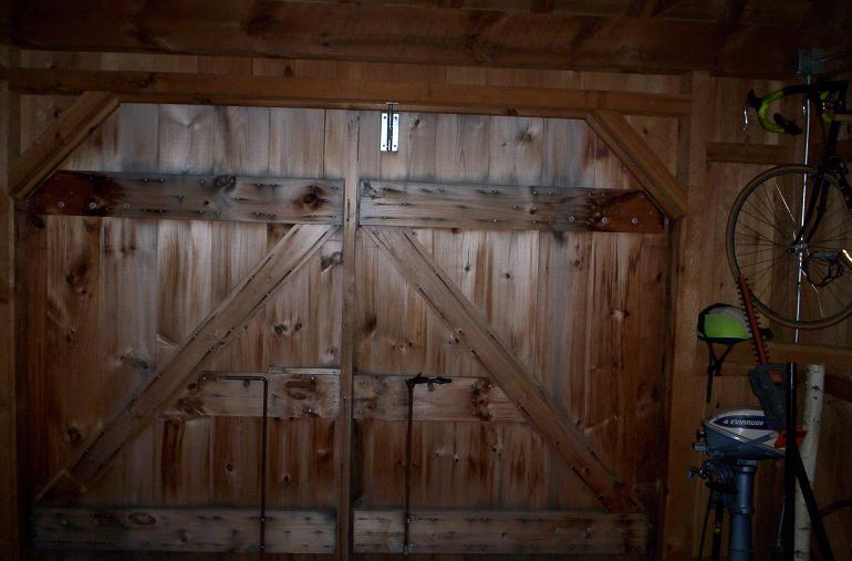 1x 6 or 8 pine[ vertical] held by a Z pattern with 2x6 or 8 pine.