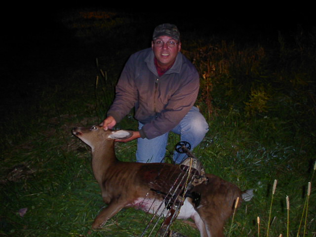 Put another doe in the freezer last night. First Mass. deer of the year. We had 5 deer hit the feilds last night a big doe with two button buck skippers, a lone doe and a nice 6 point that hung in the woods till dark. I took the lone doe at 5:00 with a 15 yard shot she dropped at 30 yards in view from my stand. Hope to hit N Y again mid week as I still have a buck tag and Joe has a doe tag and the farmer has a few crop tags we can fill.