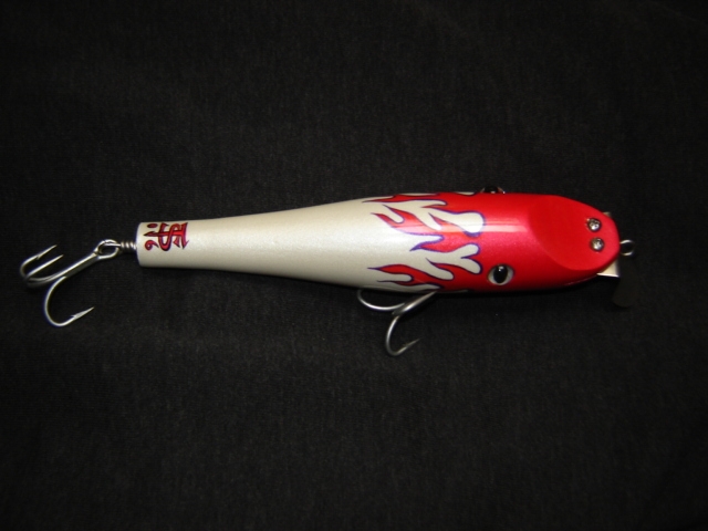 Had some fun with this one. 6.5" somewhere around 2.5-3oz (didn't way it). the plug had the lip screwed into place to all hardware can be removed in the future if it needs replaced or the plug refinished. Also sports Shannon's (my wife for those that don't know) Kustom Flame paint. Fun little plug to build and just thought I would share.